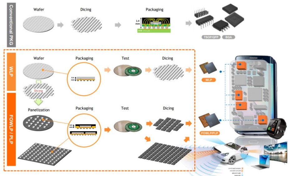 이런 제약을 극복하기 위한 것이 웨이퍼레벨패키징(WLP)이다. WLP는 웨이퍼에 바로 RDL를 형성해 공정 과정을 줄인다. 또 웨이퍼에서 바로 패키징하기 때문에 패키징 기판을 사용하지 않는다. 비용 절감 효과뿐만 아니라 칩을 가볍고 얇게 만들 수 있다. 네패스에서 물적 분할한 네패스라웨가 글로벌 전장부품 업체에 FO-WLP을 제공하고 있다.