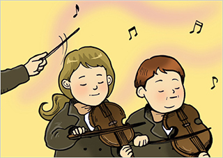 각종 악기가 조율하는 시끄러운 소리가 들립니다.