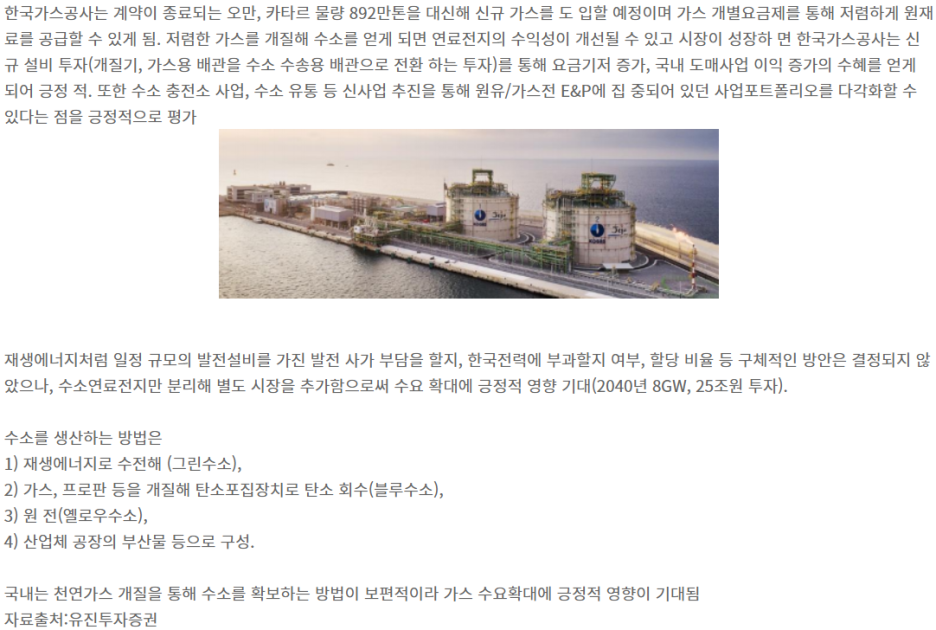 정부는 제2차 수소경제위원회에서 수소발전을 재생에너지처럼 의무화하는 수 소발전의무화제도(HPS)를 발표. 한국가스공사는 계약이 종료되는 오만, 카타르 물량 892만톤을 대신해 신규 가스를