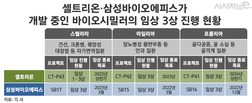 당장 내년 특허 만료를 앞두고 있는 골다공증 치료제 프롤리아의 시밀러도 삼성에피스가 먼저 출시 준비에 나설 것으로 보인다. 삼성에피스는 내년 12월 임상 종료를 목표로 하고 있다. 반면 지난 6월 3상에 돌입한 셀트리온은 2024년 상반기까지 임상을 진행할 계획이다.
