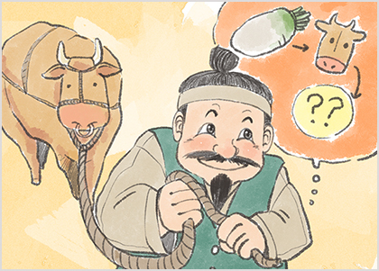 그는 착한 농부가 무를 바쳐 큰 황소를 얻었으니,