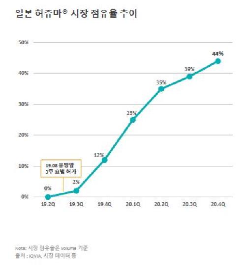 셀트리온의 바이오시밀러 허쥬마가 일본 시장을 점점 차지하고 있네요.
