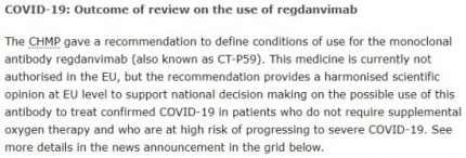 EMA는 누리집에 게재한 CHMP 결정 요약문을 통해 CHMP가 렉키로나에 대해 "산소치료가 필요없고 중증으로 발전할 위험이 높은 성인 코로나19 환자에게 쓸 수 있다고 권고했다"고 전했다. EMA는 이번 검토가 판매 승인 전 개별 국가가 렉키로나의 사용 가능성에 대해 결정을 하는 데 도움을 주기 위한 과학적 의견을 제시하기 위해 이뤄졌다고 설명했다.