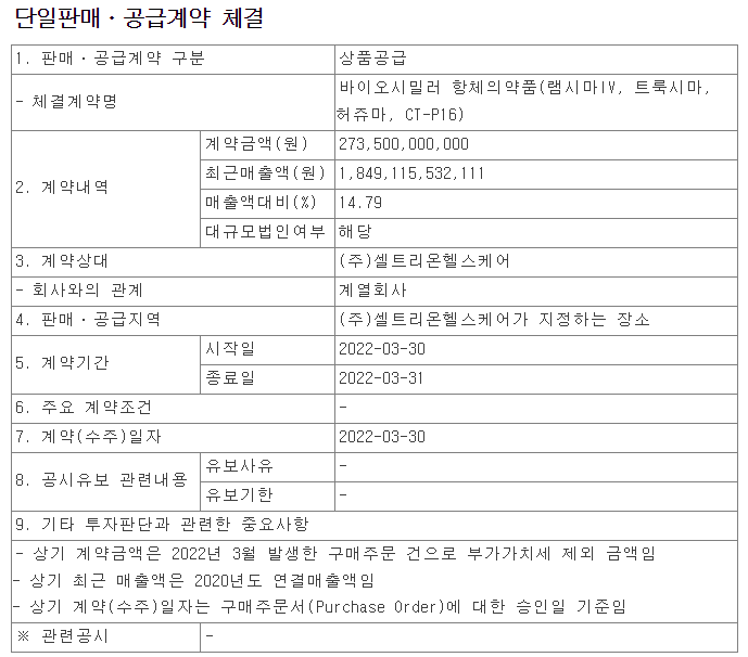 최근 셀트리온 수주공시를 보면 코로나 펜데믹에서 조금씩 벗어나면서 다른 치료제들이 필요해지는 시점으로 이어지는 것 같아요.
