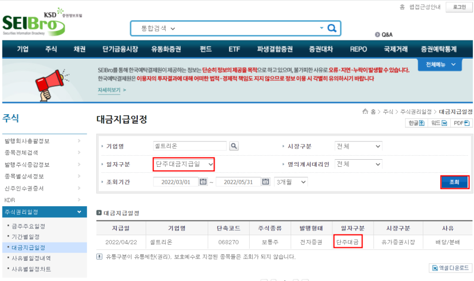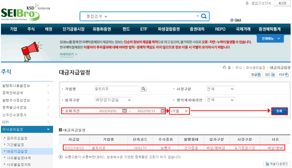 기업명을 셀트리온으로 해서 검색하고 조회기간 설정하면 아래와 같이 나오네요.