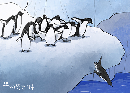 한 마리가 먼저 뛰어들면 다른 펭귄들도