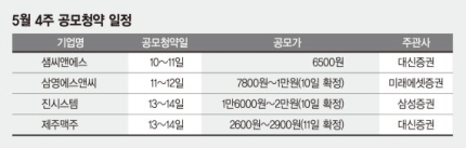 11일~12일 청약을 진행하는 삼영에스앤씨는 센서 및 센서모듈을 주력 사업으로 영위한다. 공모가 희망 범위는 7800원~1만원으로, 최종 공모가는 10일 확정된다. 주관사는 미래에셋증권이다.