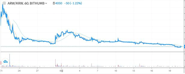 아로와나토큰은 지난달 20일 거래 첫날 상장가(50원) 대비 1000배가 넘게 올라 5만원을 넘어섰고 시가총액이 15조까지 치솟았었다. 하지만 아로와나토큰을 사용하는 금 거래 플랫폼을 구축하겠다는 계획에 대한 구체안을 내놓지 못하자 가격이 폭락해 20일 오후엔 3700원에 거래되고 있다. 그래도 여전히 상장가의 74배다.