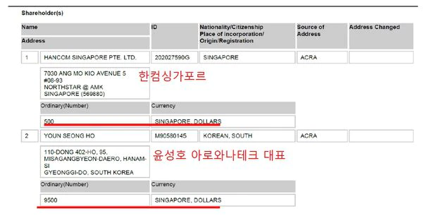 ‘한글과 컴퓨터’로 유명한 한컴그룹이 참여했다는 후광을 업고 1000배 넘게 올랐다 폭락한 가상 화폐 아로와나토큰을 발행한 싱가포르 회사의 자본금이 840만원(1만 싱가포르달러)으로 확인됐다. 한컴그룹의 지주사인 한컴위드는 지난달 아로와나토큰 상장 직전에 “한컴싱가포르를 통해 아로와나테크에 투자했다”고 발표했고, 투자자들의 관심을 끌었다. 그런데 싱가포르 기업청의 공시 자료에 따르면 한컴의 지분은 500싱가포르달러(약 42만원)이고, 나머지는 아로와나테크 윤성호 대표가 갖고 있다.
